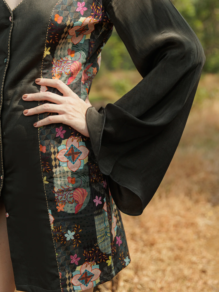 Channel quiet sophistication with this ash Echo Dress, where traditional Kantha embroidery takes center stage on the front panels. The luxurious cotton satin fabric, lined for comfort, provides the perfect balance of structure and softness. Flared sleeves add a hint of whimsy, while the ash green hue evokes a sense of serenity and evolution.