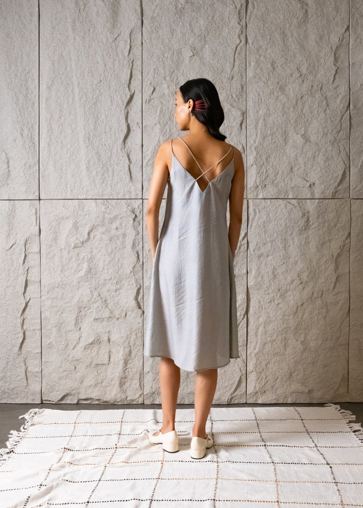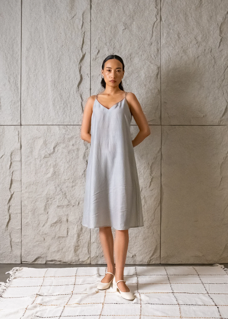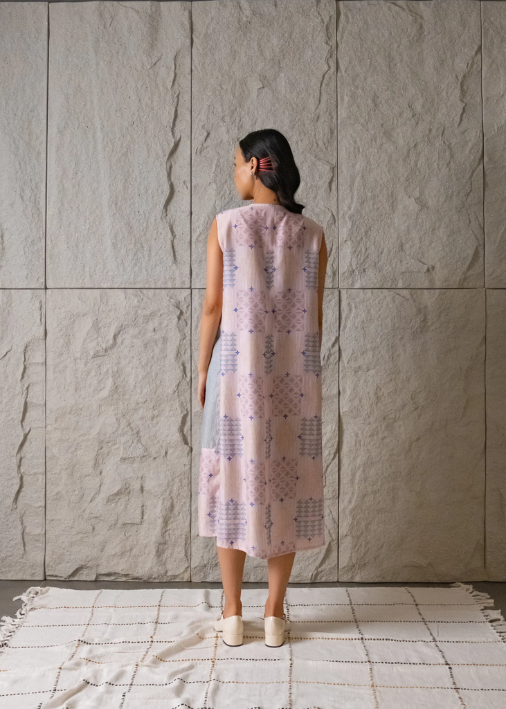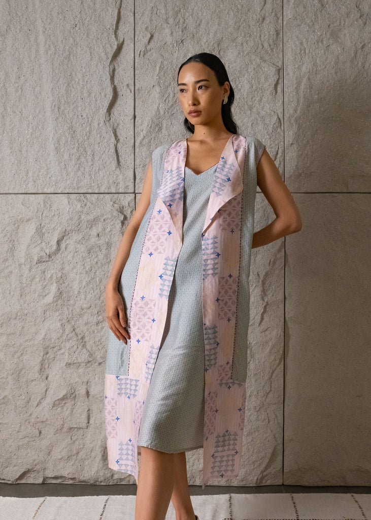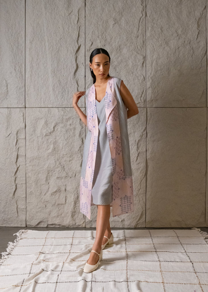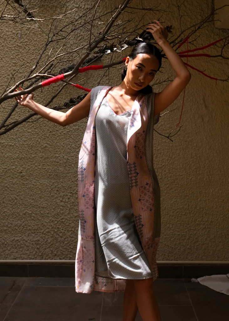 A dress and overlay set that embodies a relaxed vibe, on those days when you want to stay in and take it easy or host a lazy lunch with your closest friends. Elevated by the overall print, a strappy slip spells comfort, and a flowing sleeveless overlay with relaxed turnover collars made special with contrast print panels and seam stitch detailing.
