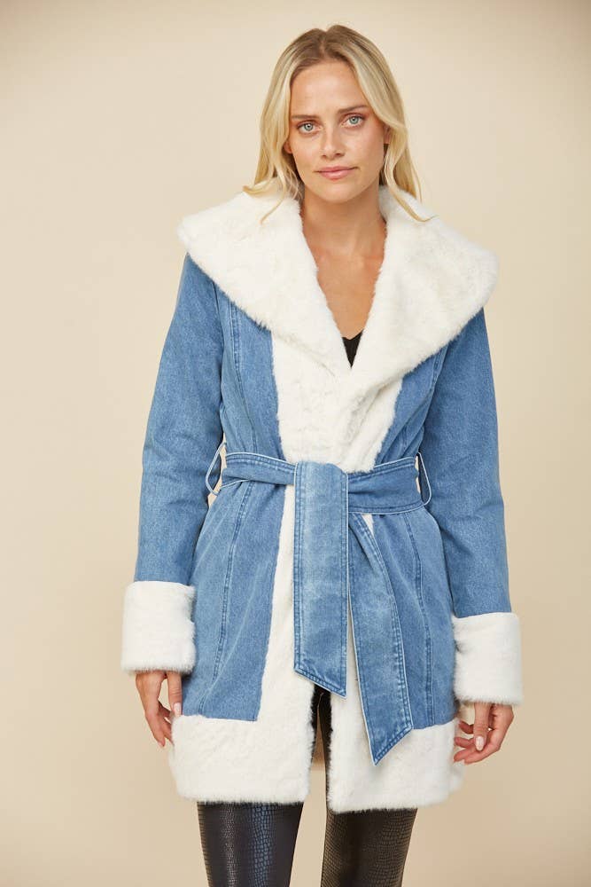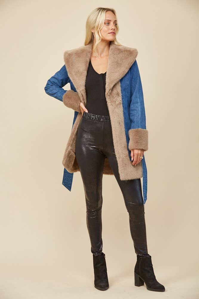 Soft Faux Fur Lined Denim Coat with Sash: Taupe
