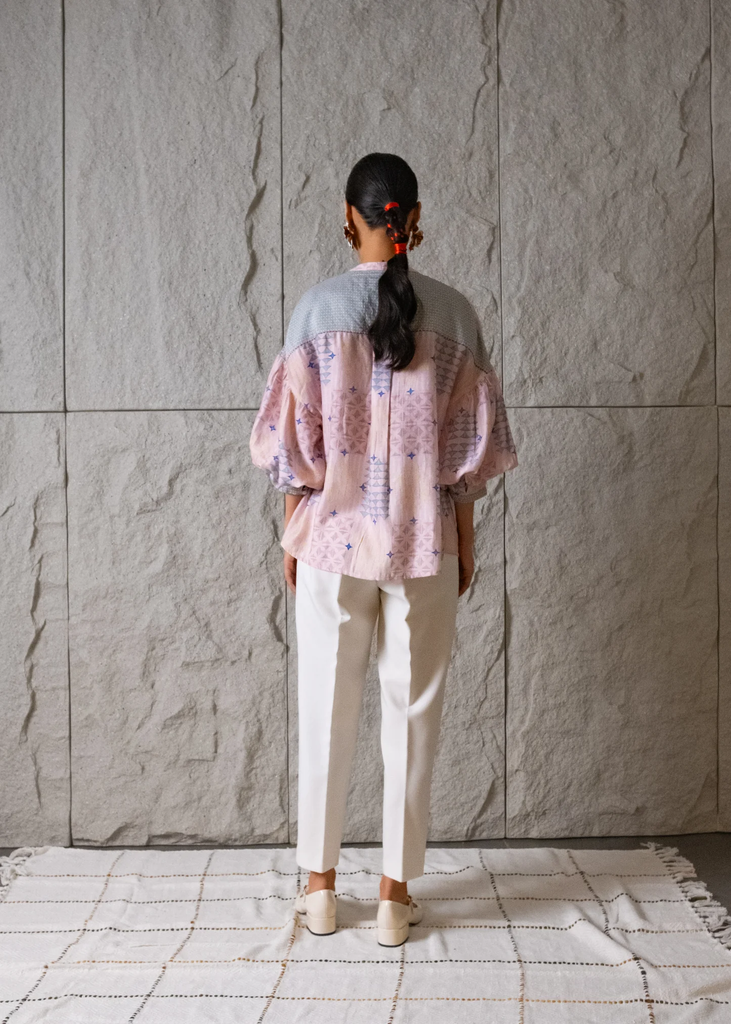 This boxy pleated top strikes the perfect balance between tailored sophistication and feminine charm. Crafted from comfortable modal fabric and covered with a kantha-inspired geometric print, this top is an easy choice for all inds of days and occasions. The balloon sleeves add volume, while the fabric-covered button detailing down the front adds a classic touch. The contrast print on the back yoke features our signature star embroidery detail.