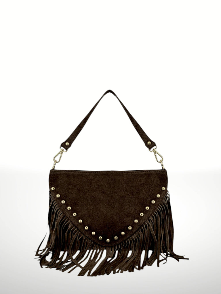 Bohemian-style hobo bag with fringes, made from genuine cowhide suede, soft to the touch and of high quality. Its flexible design naturally adapts to the body, offering comfort and a modern artisanal flair. The front features a peak-shaped flap, decorated with metal studs and long fringes that add movement and character.